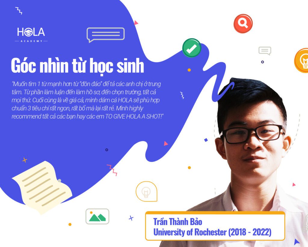 Đó là chia sẻ của Hồ Thị Mai Trang, học sinh khóa 1417 chuyên Lý trường THPT chuyên Hà Nội – Amsterdam. Trang đã tham gia khóa Apply kì 2016 tại HOLA Academy. Bạn đã được nhận vào các trường: Tulane University (#39 NU), Purdue University (#60 NU),… Cùng HOLA Academy lắng nghe những kỉ […]